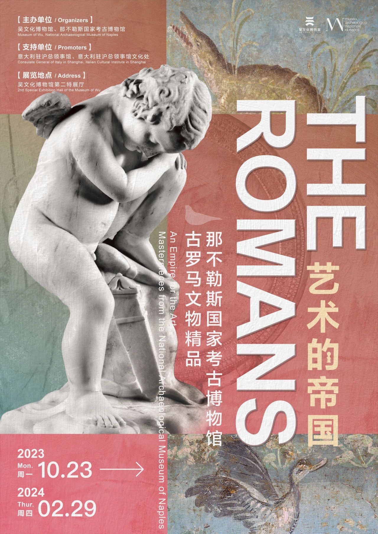 穿越千年,跨越山海 古羅馬時期的遺珍向我們揮手 璀璨的古羅馬文明向我們走來 吳文化博物館年度跨境大展 “藝術的帝國——那不勒斯國家考古博物館 古羅馬文物精品” 正式開幕 10月23日,“藝術的帝國——那不勒斯國家考古博物館古羅馬文物精品”特展開幕式在吳文化博物館舉行。這是繼2022年成功舉辦“伊特魯里亞人——古代意大利的貴族”展覽后,吳文化博物館與那不勒斯國家考古博物館的再次合作。 本次展覽共展出來自古羅馬文明的代表性文物98件/套,包括法爾內塞收藏的藏品和出土自赫庫蘭尼姆、龐貝古城的珍貴文物,囊括雕像、銀器、玻璃器、濕壁畫、馬賽克等多種藝術形式。 本次特展分為四個單元,從古羅馬藝術、人物肖像、色彩運用、技術等方面展開闡釋,帶領大家遍覽古羅馬文明的多重面貌,并重現古羅馬文明的輝煌與繁榮。 羅馬古跡遠渡重洋來到我們眼前,為我們展現了古羅馬文明對美的理解和對美的運用,讓兩大文明在兩千年后的今天在展廳再一次相遇。 金螳螂文化項目團隊將古羅馬歷史的恢弘感融入展陳設計,巧妙運用光與影,力圖在有限的展覽空間中呈現無限延伸的文化之美。 展覽時間:2023.10.23-2024.2.29 展覽地點:吳文化博物館第二特展廳